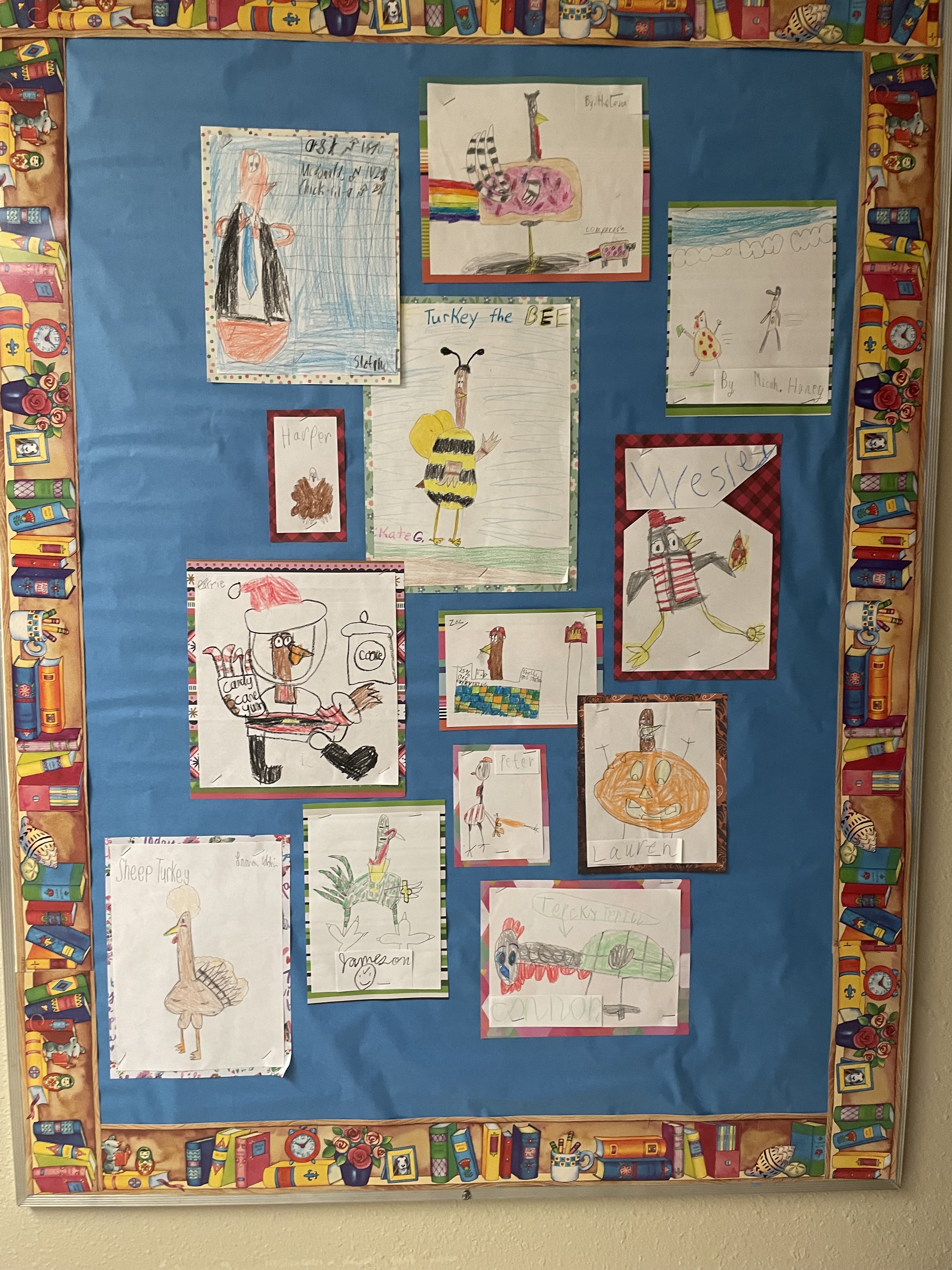 “What a visit Wendi and Lee! The kids were so very excited to finally meet you. I had talked about the upcoming visit for weeks-they were pumped. And they were not disappointed! They loved the storytelling, the songs, and the slideshow pictures (ah, the chickens, the sheep, the pigs, the dogs!). They loved learning the process a picture book goes through from a single idea to an edited manuscript; from sketches in many notebooks to the completed watercolor paintings. They were thoroughly amazed that you guys didn’t even know each other until Turkey came on the scene and needed some pretty cool disguises. And how they loved learning the steps to drawing the best turkey ever, as well as adding some pretty crazy additions to his wardrobe. I cannot thank you two enough for making the effort to visit our very small school, tucked away in an equally small town in north-central Texas. Your presentation was spot-on, and it will be a memory from the 2021-2022 school year that we will never forget!”